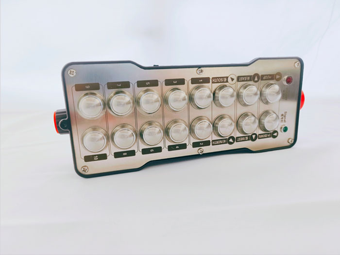 16路開關(guān)量工業(yè)遙控器,按鍵文字標(biāo)識(shí):上(UP)、下(DOWN)、東(EAST)、西(WEST)、南(SOUTH)、北(NORTH),1 、2 、3 、4 、5 、6 、7 、8 、9 、10,啟動(dòng)(START)、急停(STOP),電源指示燈(POWER)、信號(hào)指示燈(SIGNAL);